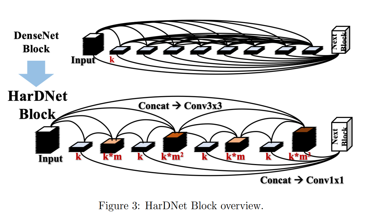 DenseNet의 original dense block을 향상 시킨 HarDNet은 Figure 3에 나와있다.