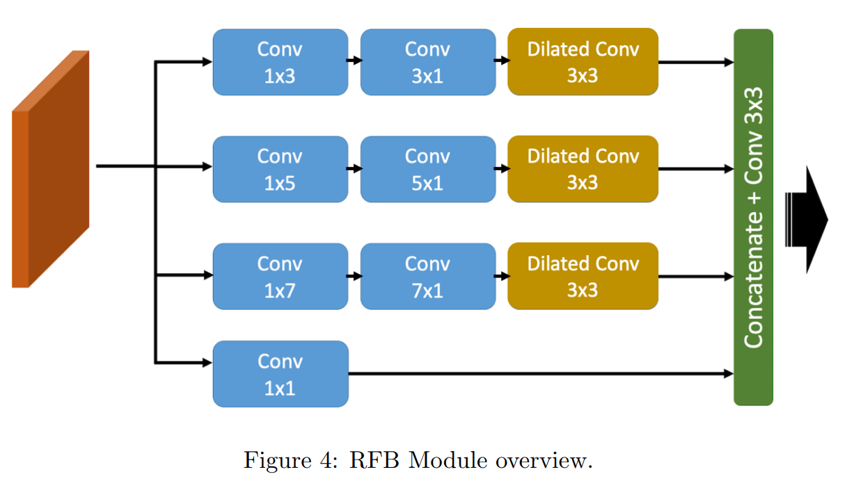 Figure 4는 RFB(Receptive Field Block)을 보여준다. 그것은 lightweight CNN backbone으로 부터 학습된 깊은 features를 강화할 수 있다. 다른 kernel size convolution과 dilated convolution layers를 가진 multi-branch를 사용함으로써, 다른 receptive fields를 가진 features를 생성한다. 그 뒤에 1x1 convolution으로 features를 합치고 final representation을 생성한다.